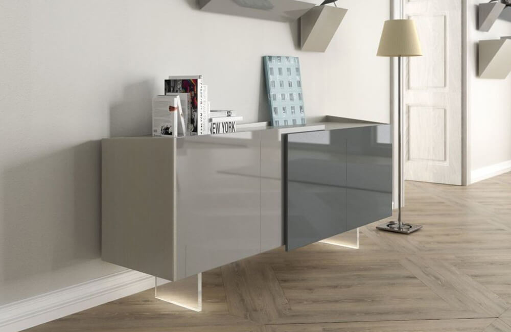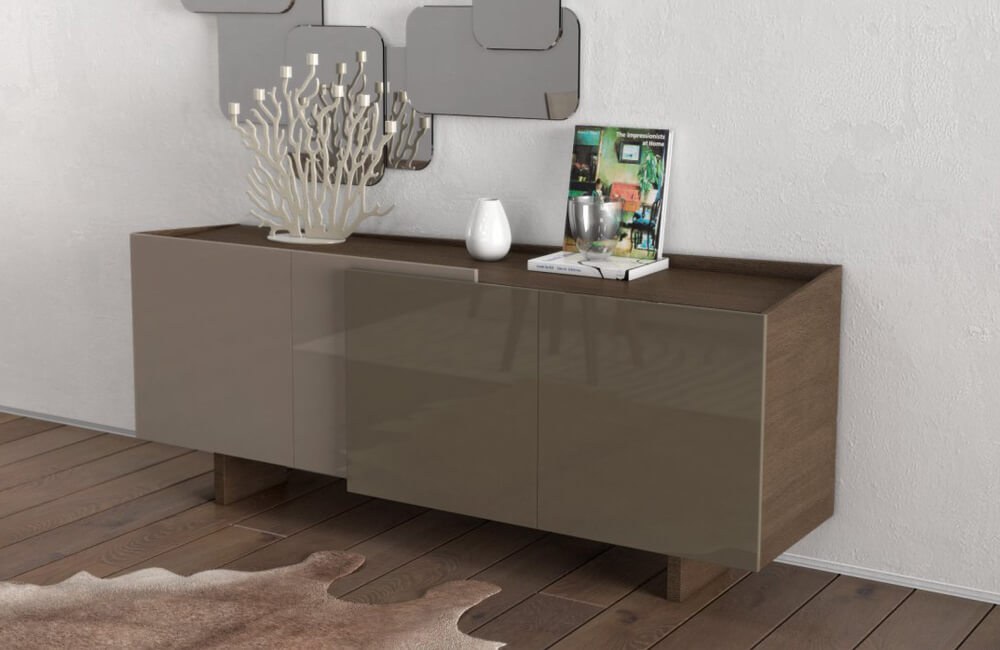 Ένας σχεδιαστικά πλουραλιστικός μπουφές με ιδιαίτερες γραμμές και έμφαση στις λοξάδες και τη διπλή πόρτα στο κέντρο που τραβάει την προσοχή.